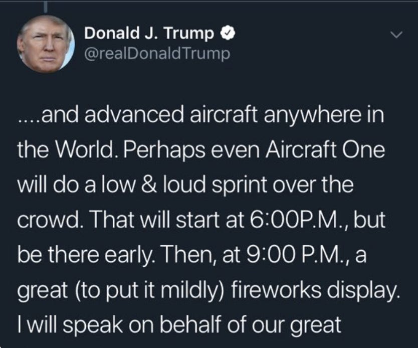A lot of people decided to ignore Trump’s planned “festivities” yesterday in protest of him commandeering the holiday for his own campaign and ego purposes. I was planning on ignoring everything, too, but so many ridiculous and concerning things happened, that I’ve decided to recount them quickly for you so that you are in the know, but also don’t feel like you’ve gotten too dirty. You’re welcome.