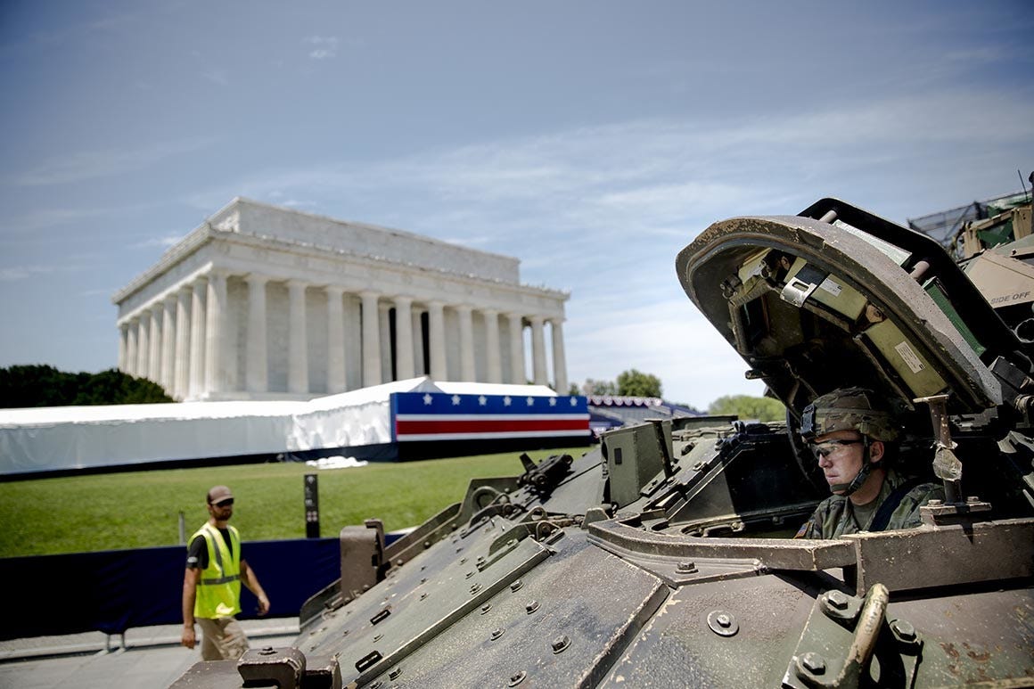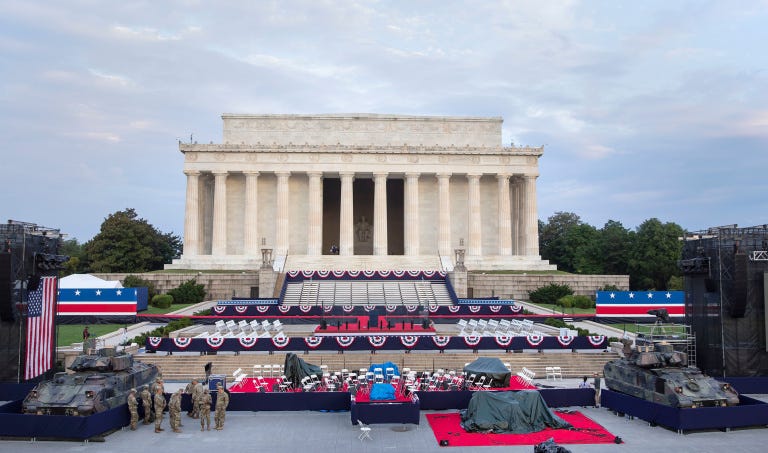 What was also interesting was the arrangement of the bleachers at the Lincoln Memorial in the very front and the placement of the tanks that Trump had been going on and on about. In a grand stroke of irony, fences were placed around the Reflecting Pool to kept non-ticket-holders away from the memorial and given the potential for lightning in the forecast, the excessive use of more metal in the pool was a questionable move.