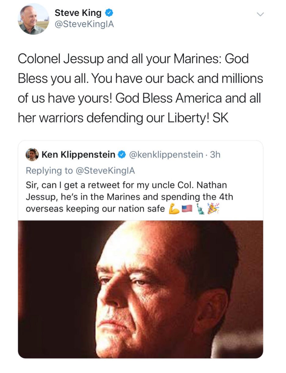 Another contender for the funniest tweet was when Rep. Steve King (R-IA), who has so many racist positions that the New York Times had to make a timeline for them, got fantastically trolled. Someone asked for a shoutout re-tweet on Twitter for “his uncle” who was really Jack Nicholson’s character in A Few Good Men and King actually fell for it. He deleted it when he figured it out, but not before we could all screen grab it for the ages and laugh…super hard. He even used his initials after the tweet to indicate that he was sending the message personally. Too good.
