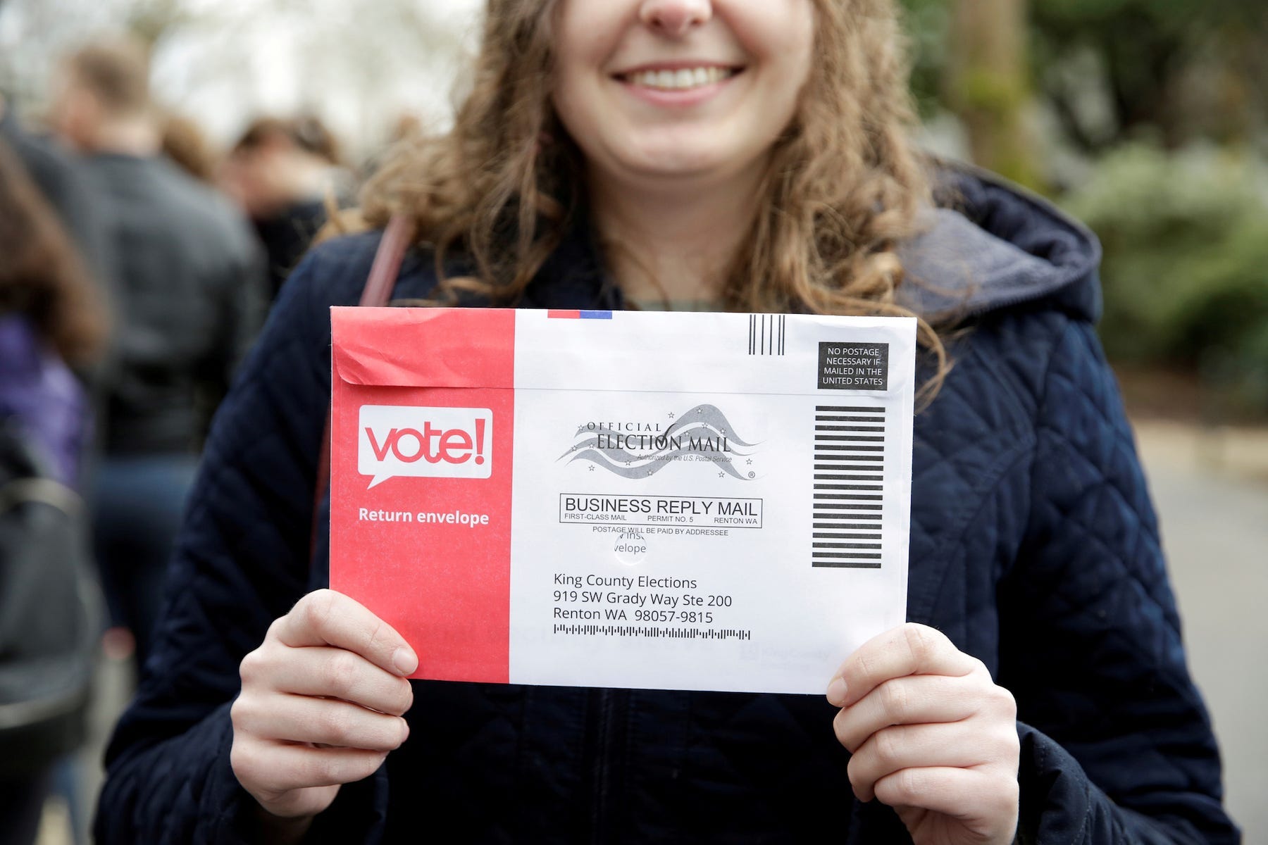 (A Seattle woman holds up her vote-by-mail ballot at the Seattle Center Armory in Seattle, Washington, U.S., on February 22, 2020. Photo by Jason Redmond, via Reuters.)