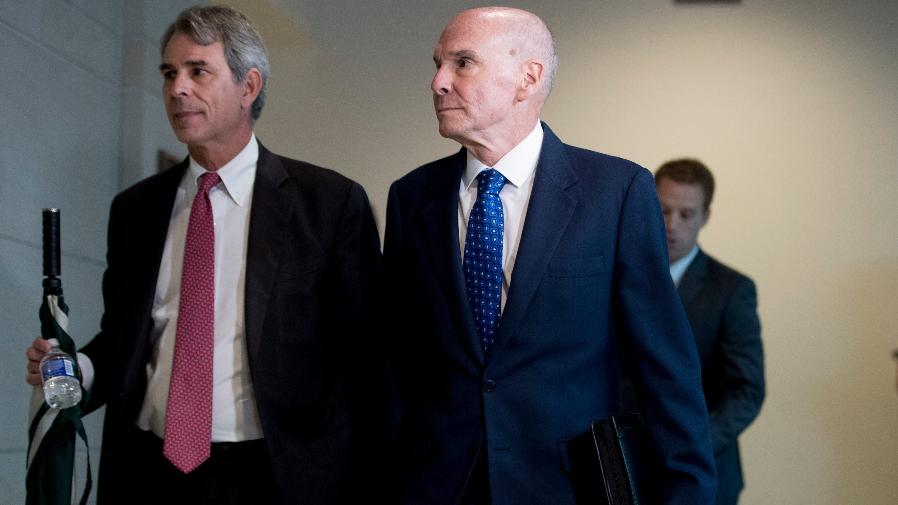 (Michael McKinley, right, the former top aide to Secretary of State Mike Pompeo, arrives on Capitol Hill on Oct. 16.)