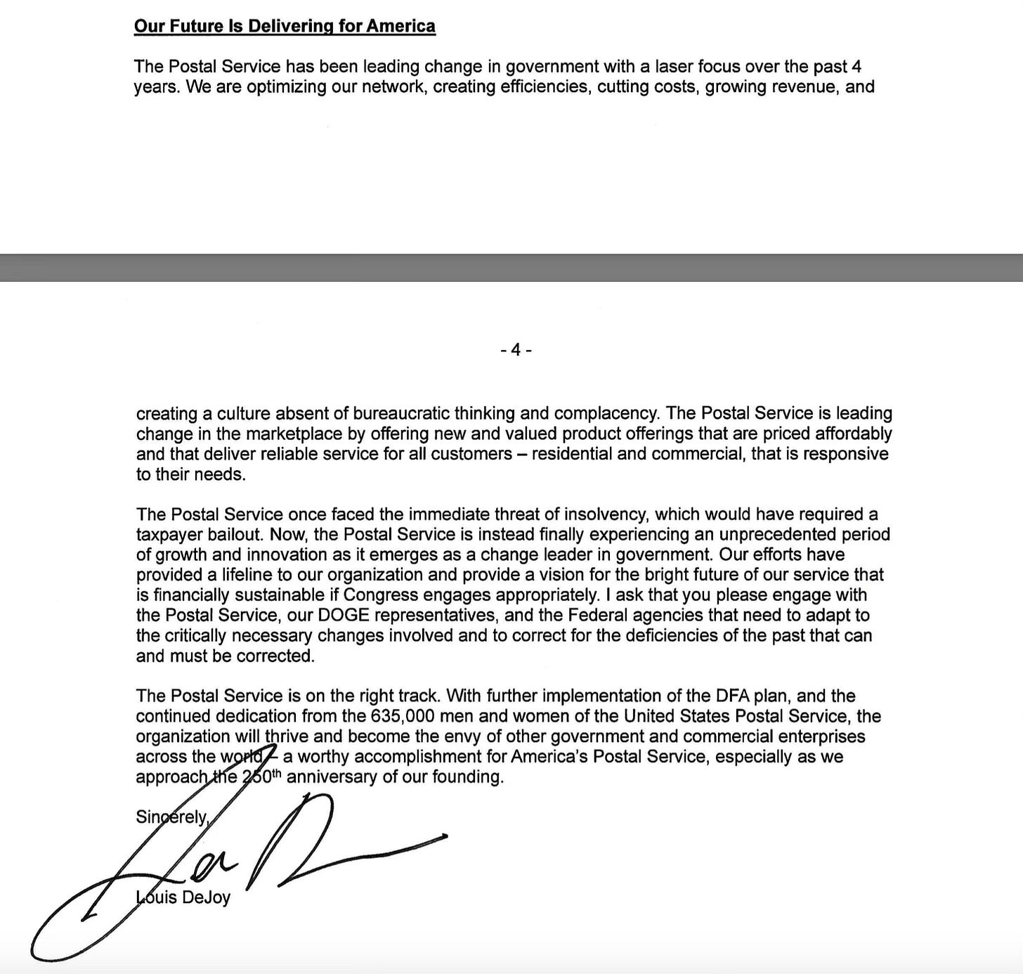 "The fact is that DOGE is the only other game in town that seems oriented toward helping us to achieve our efficiency and cost goals that are reflected in the DFA Plan," DeJoy wrote. This statement is also a misnomer in that the immediate solution to funding the USPS and making it a profitable and reliable enterprise is to simply fund the mandates that Republicans have refused to fund.