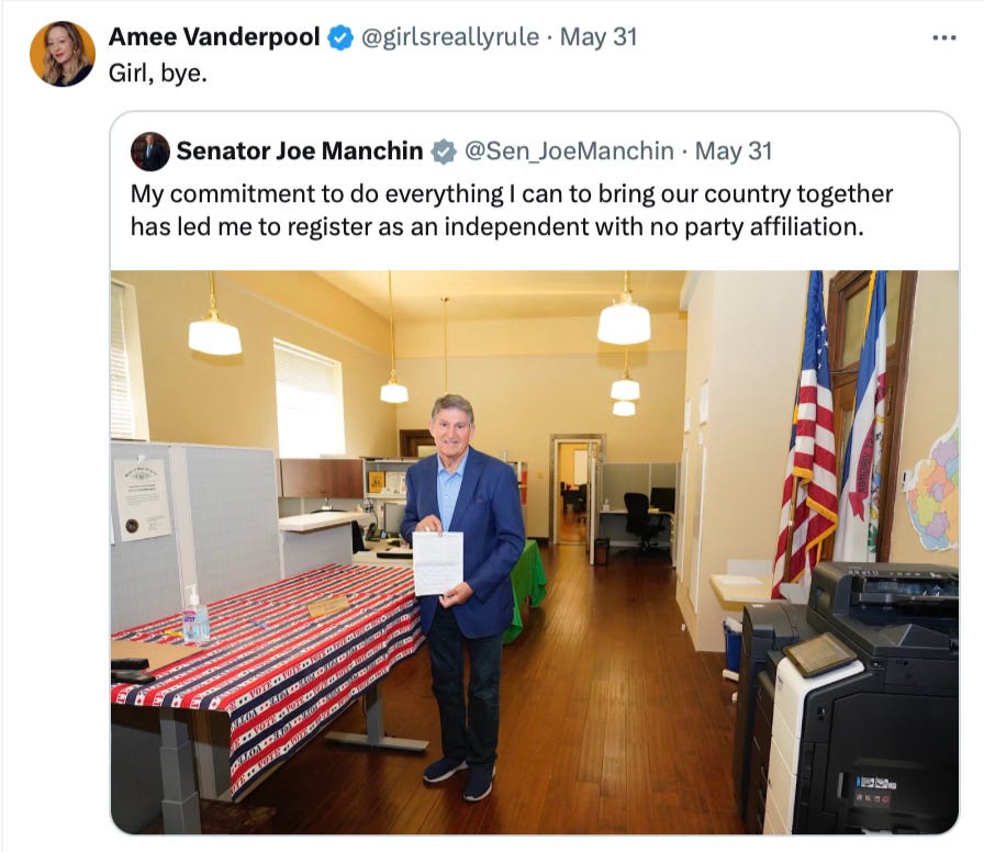 Senator Joe Manchin (WV), who considered an independent presidential bid earlier this year, officially left the Democratic Party on Friday and formally registered as an independent.