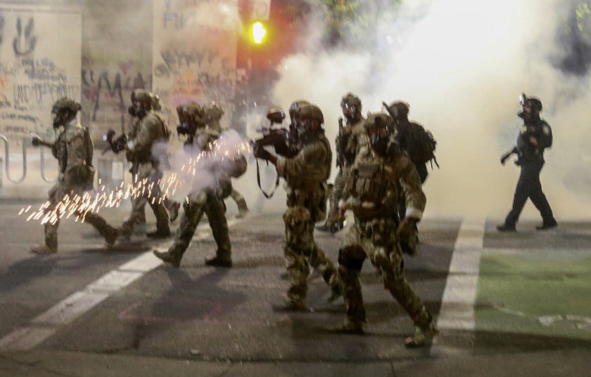 (Federal officers fire tear gas at protesters in July in Portland, Oregon. Photo by Dave Killen, via Oregonian.)