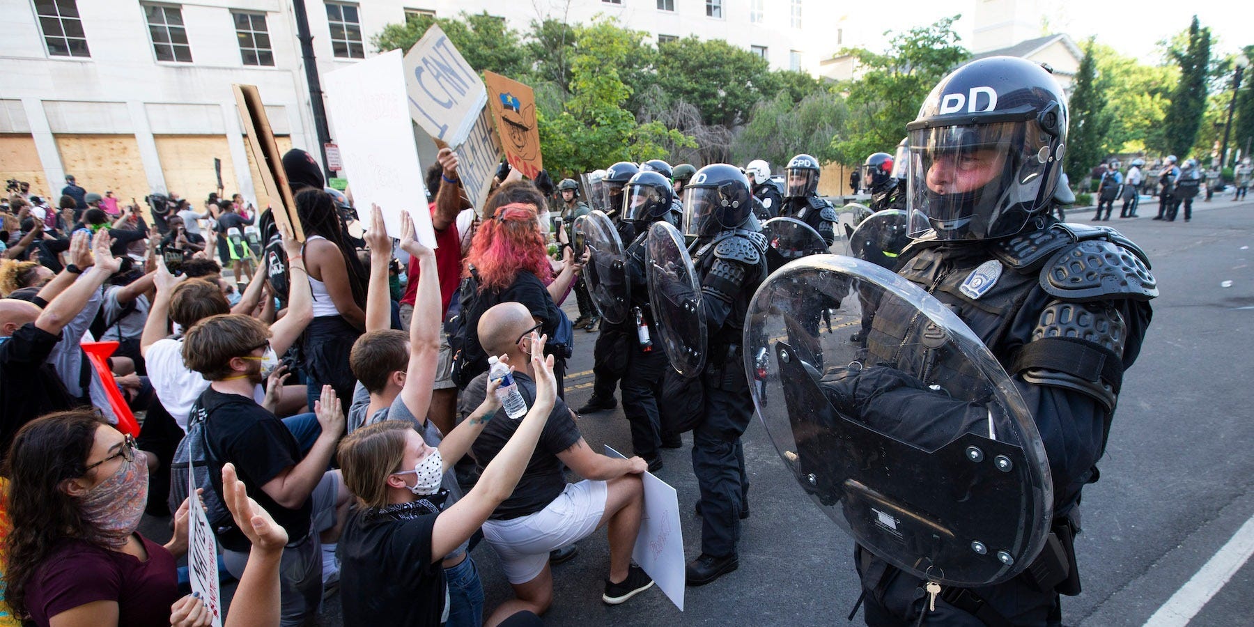 (Police officers clash with protestors near the White House on June 1, 2020 as demonstrations against George Floyd's death continue. Photo by Jose Luis Magana/AFP, via Getty Images.)
