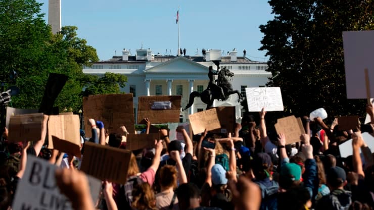 (Demonstrators hold up placards of protest outside of the White House, over the death of George Floyd in Washington D.C. on June 1, 2020-this is the same location where peaceful protestors were sprayed with pepper spray tear gas bullets just a few days later with no warning. Photo by Jose Luis Magana/AFP, via Getty Images.)