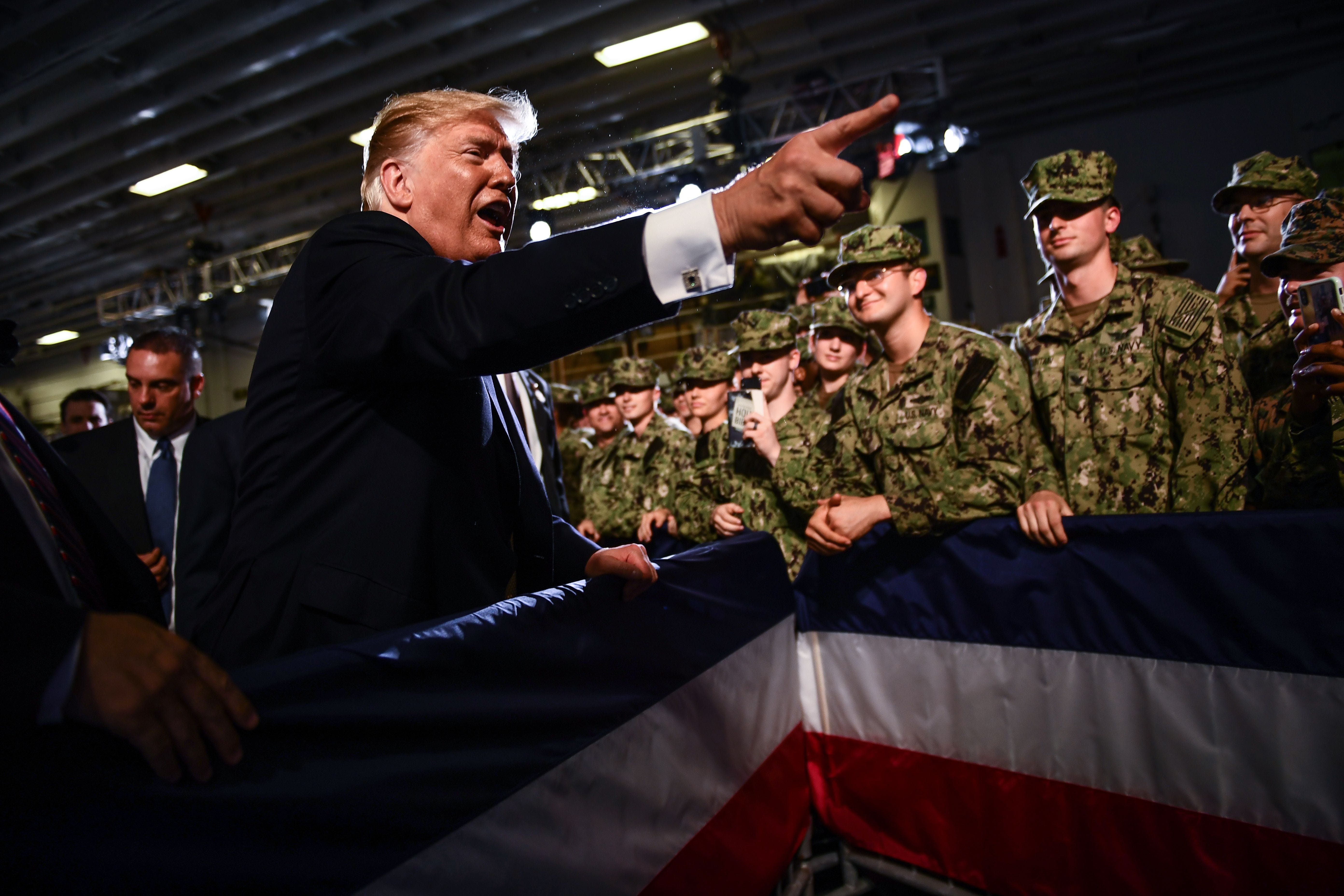 (Trump greets Marines aboard the amphibious assault ship USS Wasp (LHD 1) during a Memorial Day event in Yokosuka on May 28, 2019-has deployed federal soldiers all over America this summer, which has only inflamed tensions and violence at protests. Photo by Brendan Smialowsky/AFP, via Getty Images.)